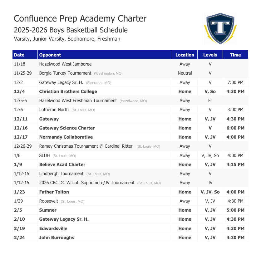 2025-2026 Confluence Prep Academy Charter Boys Basketball Schedule